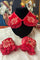 Set elegant format din guler și manșete brodate cu model de trandafiri, realizat din materiale fine, în nuanțe intense de roșu, cu broderie florală aurie. Trandafirii, simbol al feminității, pasiunii și rafinamentului, sunt puși în valoare de volanele delicate din material transparent, care adaugă volum și un aer sofisticat întregului ansamblu.
