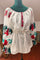 O piesă luminoasă și expresivă, această bluză este realizată din material fin, semitransparent, în nuanță ivoire, pus în valoare de broderii geometrice dispuse pe mâneci, în tonuri vibrante de roșu și verde. Inspirată din motivele tradiționale românești, bluza aduce un aer proaspăt și autentic, reinterpretat într-o formă modernă și ușor de purtat.