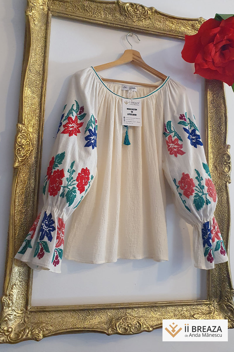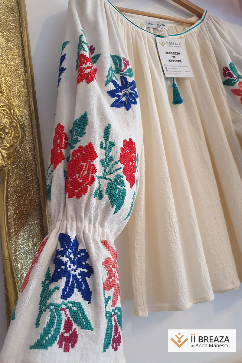 Această ie de colecție îmbină armonios vechiul și noul, fiind realizată cu mâneci din material vechi, cusute manual cu motive florale pline de vitalitate. Nuanțele calde de portocaliu se împletesc cu verdele viu și accentele de albastru, dând viață unei broderii vibrante și rafinate, specifice artei populare românești.